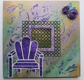 Cover a square frame with sparkle medium. Put the garden chair stencil onto some white card and spread sparkle medium over it. When dry, cut out the seat leaving a tiny border of white card showing. Add some gold card to the aperture, then glue the green die-cut trellis over the aperture. Glue the square frame on top of the trellis and glue the cut out chair to the bottom left of the MDF board. That's the front finished.
