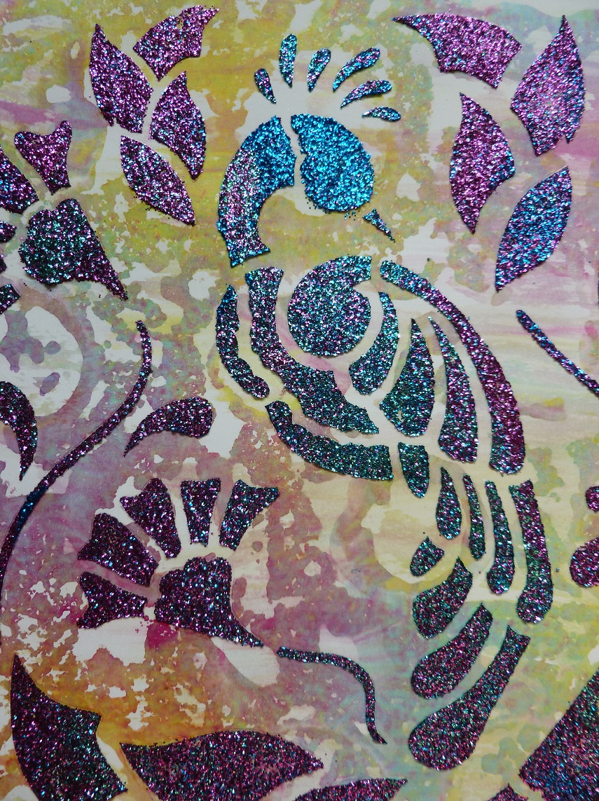When dry, lay the stencil onto the coloured card and spread both colours of Sparkle Medium over the design, using the metal spatula. Remove the stencil and leave the image to dry.