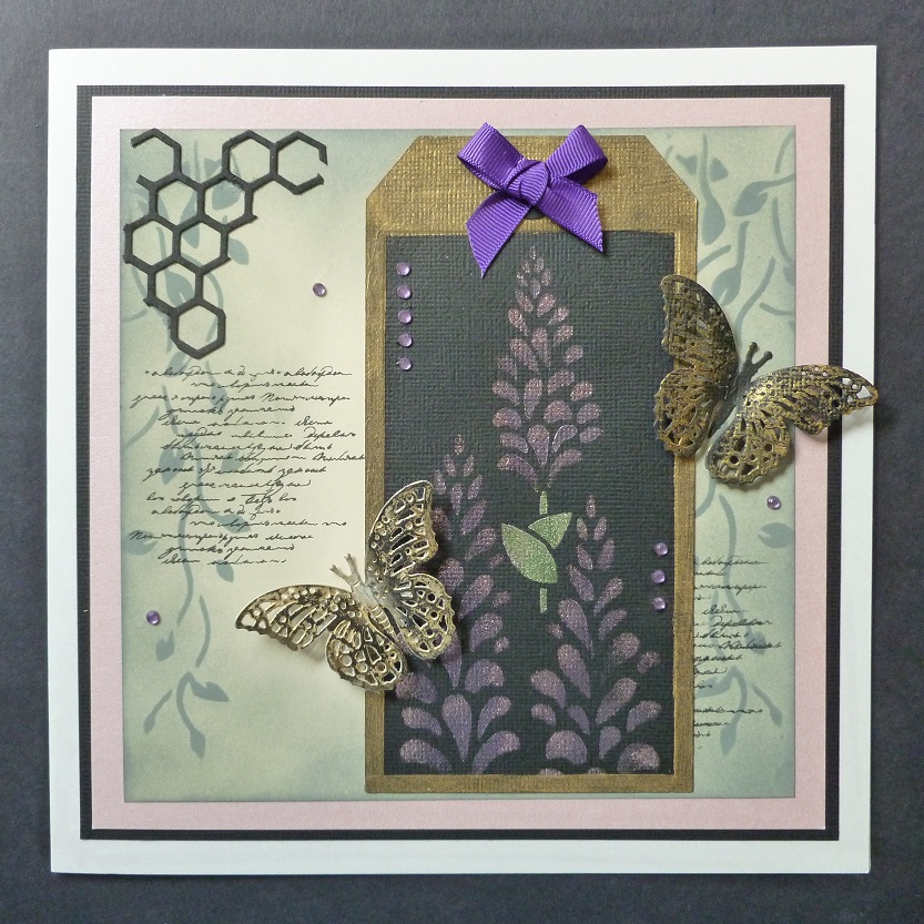 Die-cut a large tag shape from black card. Lay the flower stencil (which in this case I have used as a Lupin flower but could also be used as a Wisteria plant), a very versatile stencil) Stipple some Cadence Menthol metallic paint onto the leaves and stem, some amethyst and dried rose onto the flowers. Remove the stencil.
